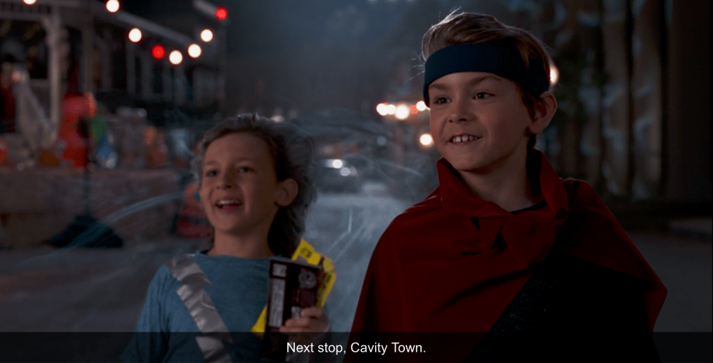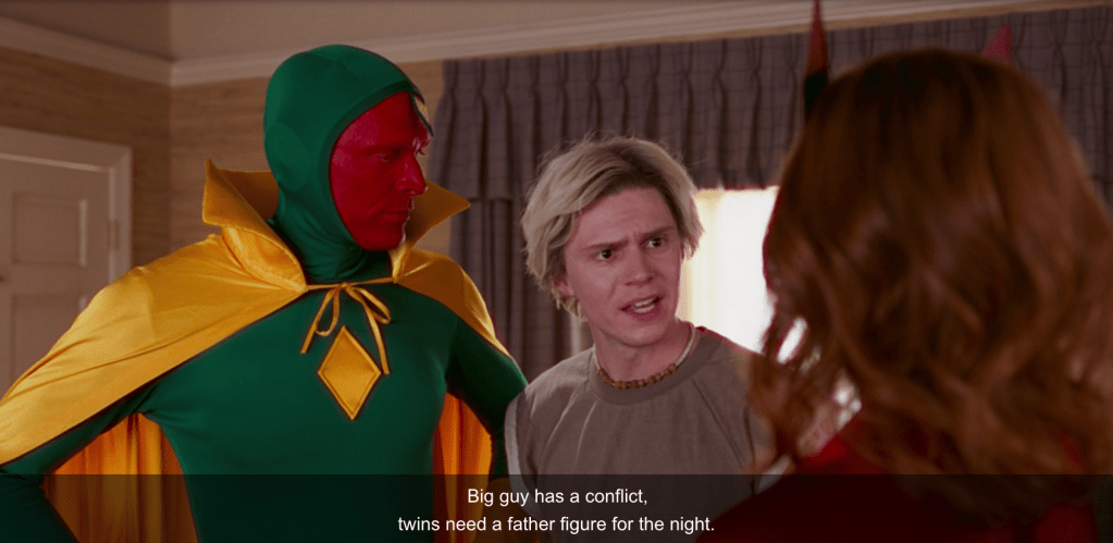 Based on the original release schedule (prior to the pandemic of 2020), I believe the Halloween motif was meant to be a big deal. I still think it’s possible that it will connect to other shows down the line. The dialogue between Pietro & the boys is disarming as “Uncle P” seems to have a real affinity for the kids (as if they were his own). His line about ‘blood being thicker than water’ doesn’t go unnoticed. This holiday theme is perfect for explaining the incredibly dramatic costumes attributed to Scarlet Witch & The Vision in the comics. Wanda has now explained that her costume is modeled after a Sokovian fortune teller and Vision relents that he looks like a Mexican wrestler. All 1980s Marvel fans should’ve gotten a kick out of that.