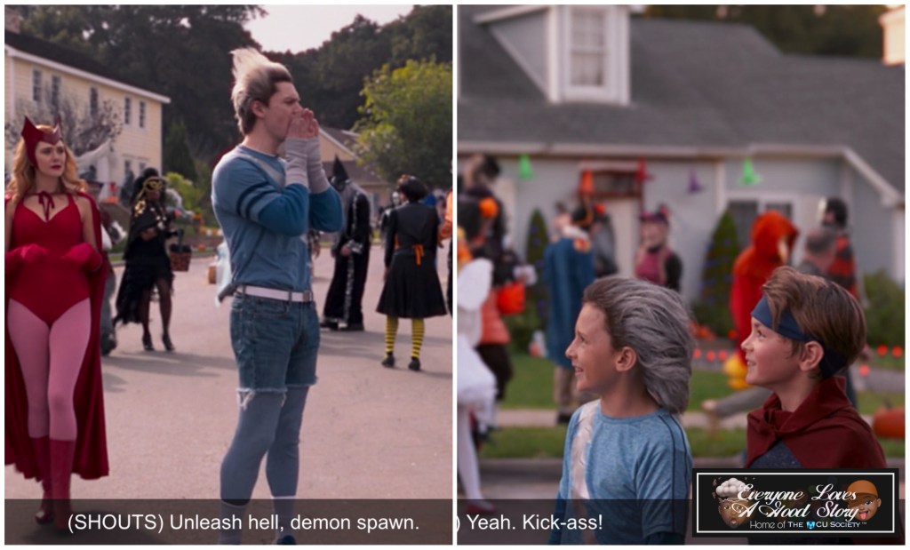 Back in The Hex, the Trick or Treating is under way. Pietro gives us another Mephisto clue by encouraging the twins to raise Kane by yelling out “Unleash Hell, demon spawn!” (See how that soda can clue stacked up so quickly?). Avoiding Wanda’s questions, Pietro tries to run off with the twins, but not before Tommy brilliantly says the phrase “kick-ass” which triggers Wanda to repeat it. This is one of those creative inferences that I alluded to. Wanda wants to know why Evan Peters’ Pietro doesn’t look like Aaron Taylor-Johnson’s version; her brother in The MCU. Both Peters and Taylor-Johnson starred in the movie, Kick-Ass together and this was a way to jog all of our memories; including Wanda’s. Well done.