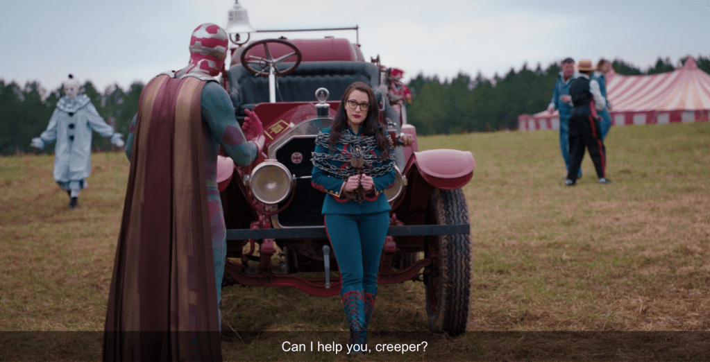 Vision is back again, in pristine condition. Resurrected for the third time, he awakens to realize that the SWORD agents he was trying to reach for help have been turned into a traveling circus show; nice job Wanda. Agent Monti, Director Hayward’s goon that left Darcy handcuffed to a truck in order to save his himself from the expanding Hexus, has been turn into a strongman. He is wearing an S on his belt that could be an easter egg for The Sentry but I just think it’s a similarity. Darcy is still chained to a vehicle, but as the circus’ escape artist. Mistaken for the new clown, Vis is left to meet Darcy. The comedic chemistry between these two is great. It is hard to describe the hilarious ambiguity of Vision trying to talk to Darcy; unless you’ve watched “clowns” try to pick up women before. LOL. Darcy’s costume shows off her shape where she has never been shown in this light in the MCU before. I am wondering if it was just to make the scene pop more or if this is to symbolize that her crossing the Hex field has change her in some way. Will Darcy become an enhanced? She mistakes Vis’ sophomoric self-introduction as an advance and walks away. I laugh every time I see this scene.