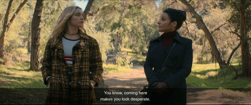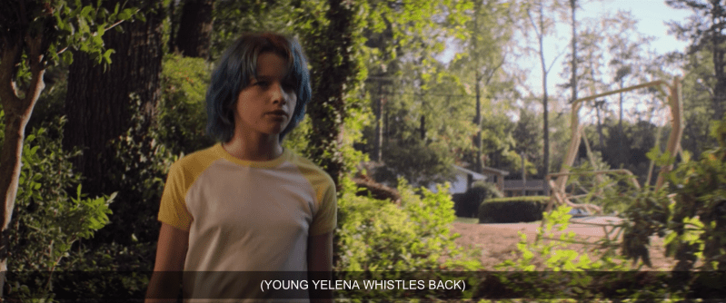 From his well delivered but awkward stare at Rachel (alerting her that it is time to run) to him taking control of the team & situation in order to flee the fallout from the fire at North, David’s beats were all on point. As I previously stated, the quickly referred to North Institute disk seems to be a macguffin of epic proportions. The story of this family of undercover Russian operatives, their 3+ years in Ohio and the history of North Institute is a Disney+ (or Hulu) series I want to see! Shortland’s direction shines bright from the moment the “family with no name” drives away from Young Yelena’s “home”. While other kids are playing in their front yards, young Nat & Yelena are playing a game of life & death; with only one of them even being aware of the stakes. The facial reactions and apprehension of Alexei & Melina seeing the fire at North before making a smooth right away from police activity and gingerly driving while their allegedly 6 year old daughter sings “…this could be the day that I die.” (Don McClean’s 1971 hit song, “American Pie”) instinctively raised the level of gravitas and irony.