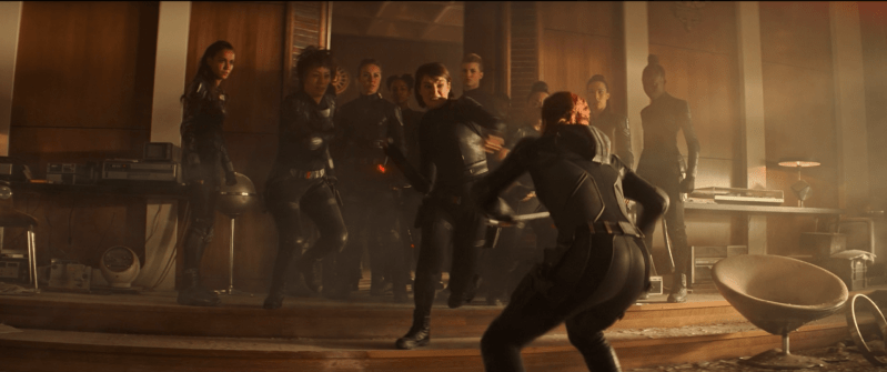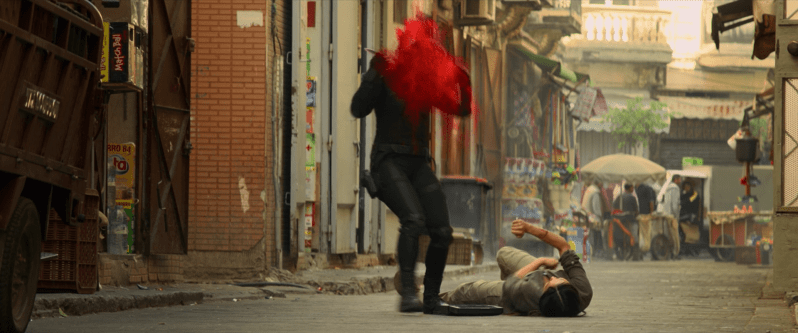 The pace of the movie picks up rather quickly once Yelena (played by Florence Pugh) appears as an adult in Morocco. Perched above what I believe to be the location where The United States created their first Consulate/Embassy in 1797, within the blue walls of Medina, she is vicious and the leader of her team of Red Room assassins hunting a scientist named Oksana. The second major macguffin appears in the form of red vials containing the antidote to the mind control chemical of which all of the subservient Black Widows from Dreykov’s Red Room are under the influence. No official word has been given but some are calling the antidote, “red dust”; yet another name to a plot point that is noticeably absent again. There is no mention of the chemical’s name, nor the name of the antidote. At this point I wonder if this a dead end movie that will give us as little as possible to look forward to in future Marvel projects or if this too will be a part of a “Black Widow” series in the future (starring Ever Anderson, maybe?). Do you think not telling us details like undercover spy names, the name of the mind control agent or its antidote is a good thing or a bad thing? Regardless, the significance of the Morocco scene should follow Yelena beyond this film into her other future appearances in the The MCU. She had been under mind control for the majority of her life, in one form or another. Once free, her mission becomes freeing all the others and creating a life that she can appreciate; re-defining herself (and the Black Widow moniker). On the flip side we see Taskmaster (Antonia Dreykov; played by Olga Kurylenko) for the first time right after Yelena’s path is set up. Both of these characters are vastly different from their comic book origins. Both represent a part of Natasha’s past that she has not been ready to deal with up to this point. That is pretty much where the similarities end.